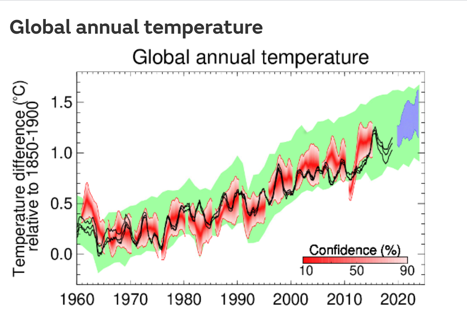 In a regular “decadal forecast” looking at predicted near-term climate trends, it said that each year between 2020-2024 is set to be 1.06-1.62C hotter than historical averages.