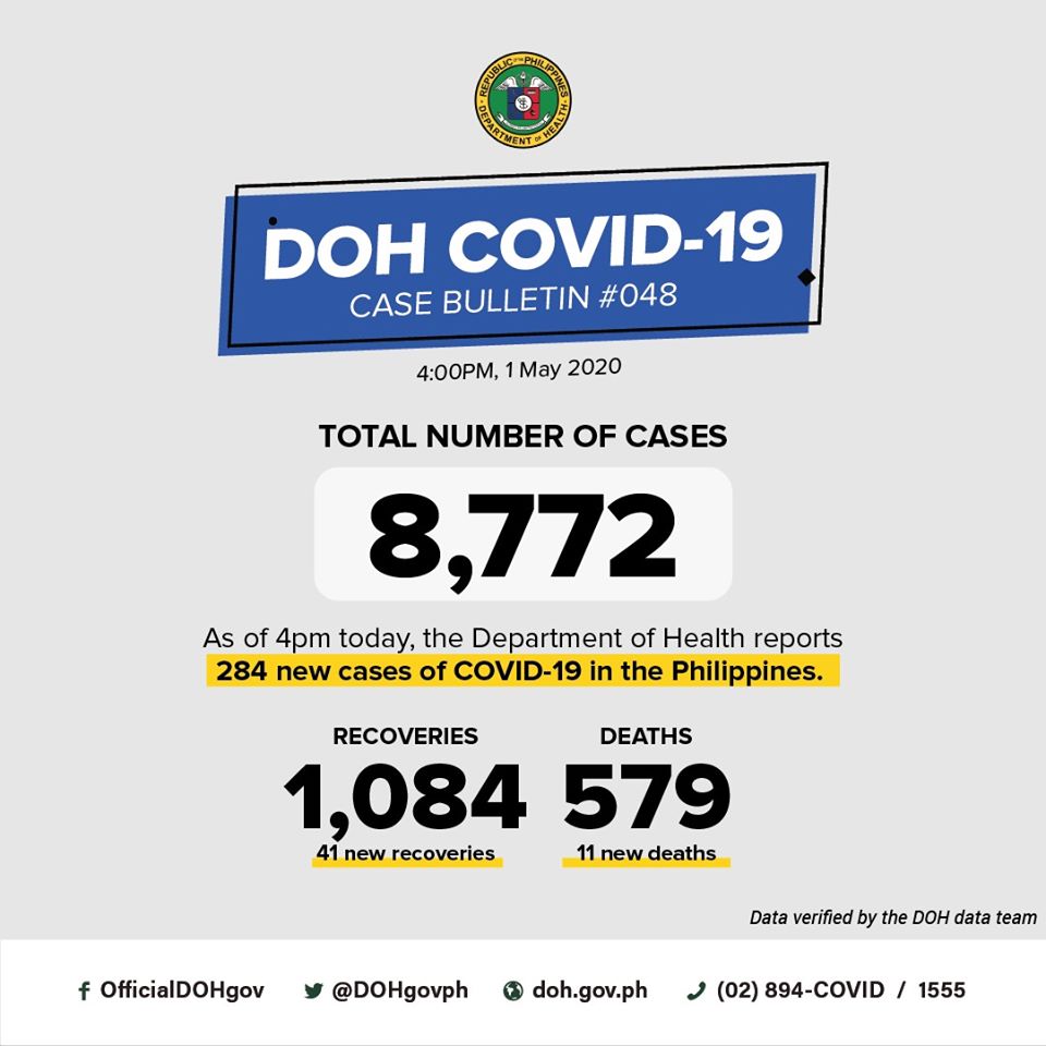 (Eagle News) — The number of coronavirus disease 2019 cases in the country has risen to 8772 after the Department of Health reported 284 new cases on Friday, May 1.