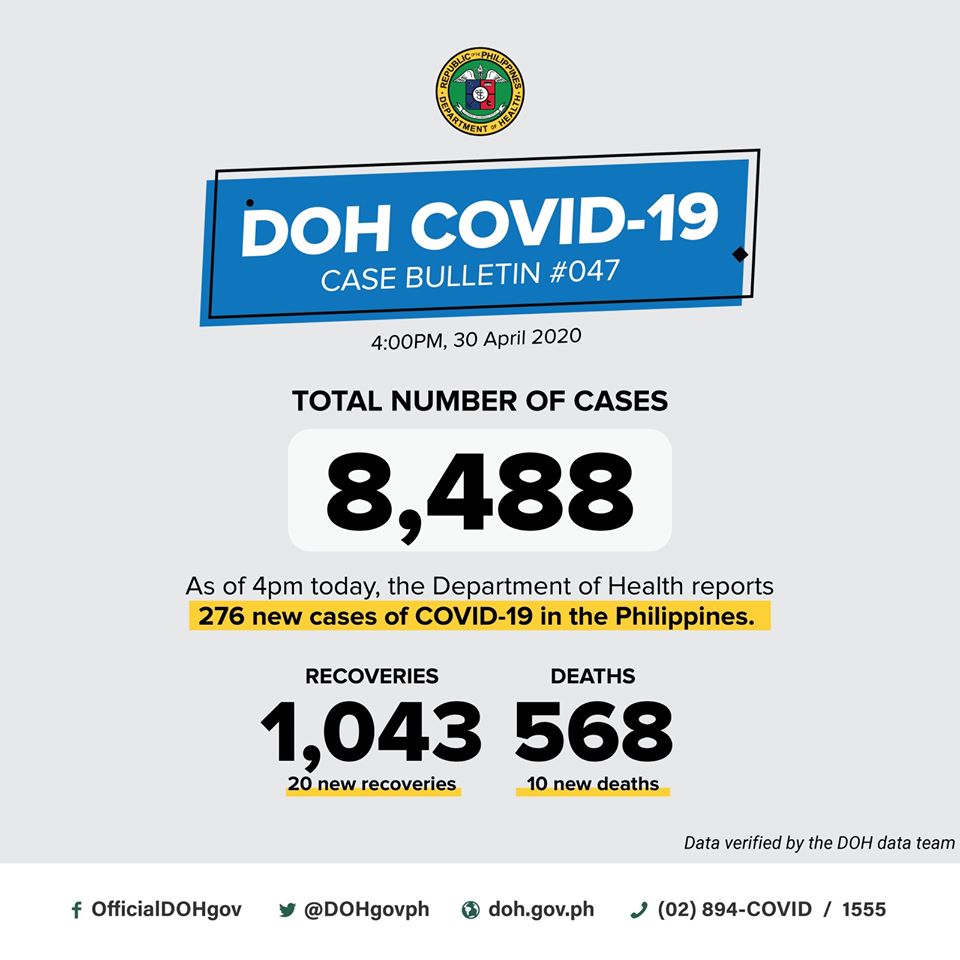 (Eagle News) — The number of coronavirus disease 2019 cases in the country has increased to 8488, after the Department of Health reported 276 new cases on Thursday, April 30.