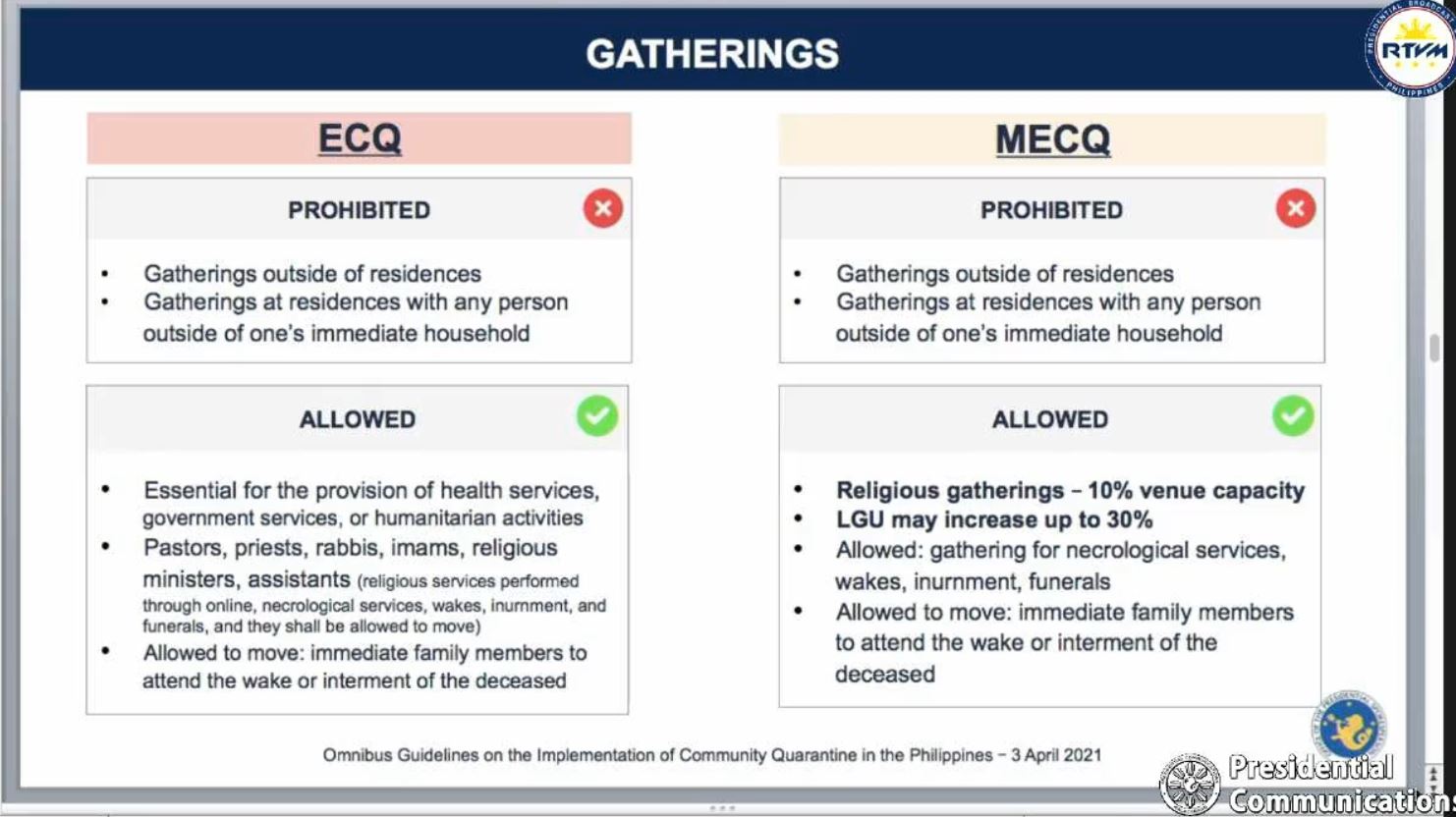 “Pinapayagan na po ang religious gatherings sa MECQ hanggang 10% venue capacities. Pero ang LGU po ay pupuwedeng increase-an ito hanggang trenta porsiyento. (Religious gatherings in MECQ areas are allowed up to 10 percent of the venue’s capacity. But the LGU can increase this up to 30 percent),” Roque said Monday, April 12.
