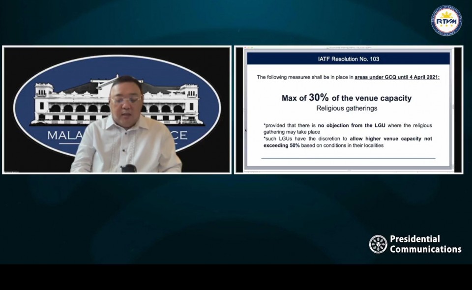 Ang mga religious gatherings ay kailangang mag-observe ng maximum ng 30 percent ng venue capacity nang walang pagtutol o objection mula sa lokal na pamahalaan,” Roque announced on Friday.