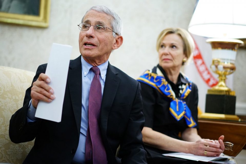 Dr. Anthony Fauci (L), director of the National Institute of Allergy and Infectious Diseases speaks next to Response coordinator for White House Coronavirus Task Force Deborah Birx, during a meeting with US President Donald Trump and Louisiana Governor John Bel Edwards D-LA in the Oval Office of the White House in Washington, DC on April 29, 2020. (Photo by MANDEL NGAN / AFP)