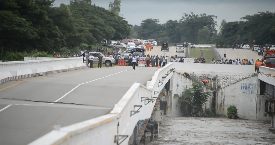 The heavy weight of the floods also fractured part of a bridge on the Yangon-Mandalay highway linking Myanmar’s two biggest cities, throwing the country’s traffic artery into disarray.