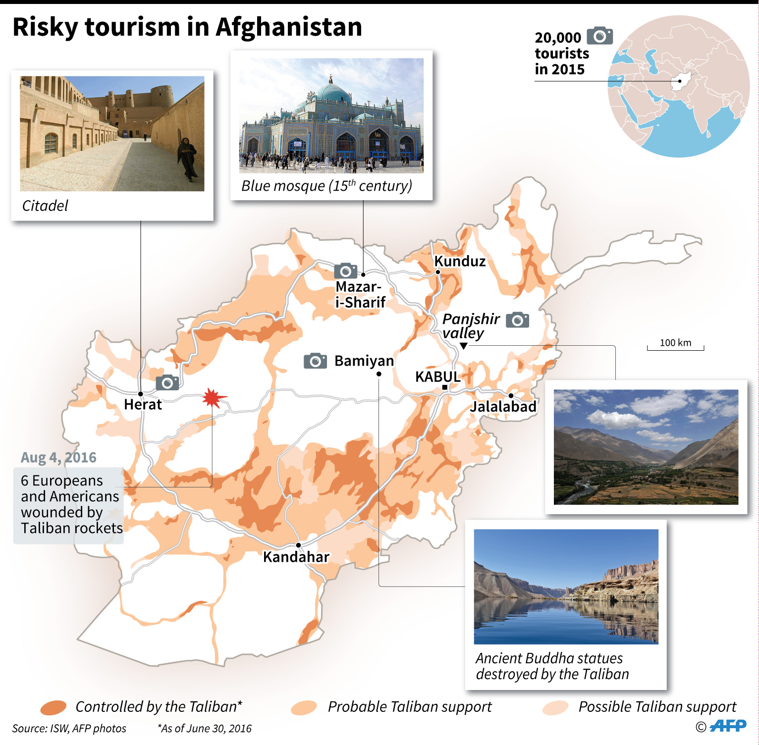 Map of Afghanistan with photos of major tourist attractions, and areas controlled by the Taliban.