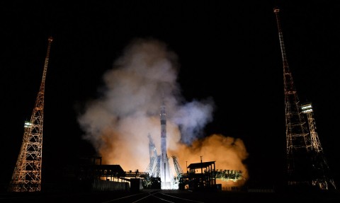 Russian, US and Kazakh flags could be seen fluttering in the wind nearby.