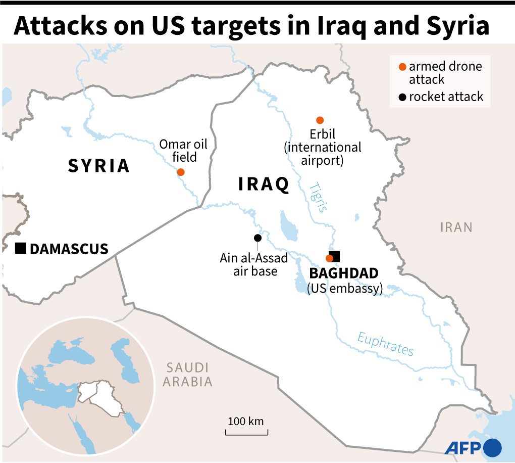 BAGHDAD, Iraq (AFP) — Three rockets were fired at the US embassy in Iraq early Thursday, the Iraqi army said, at the end of a day marked by rocket and drone attacks on bases hosting American forces in Iraq and Syria.