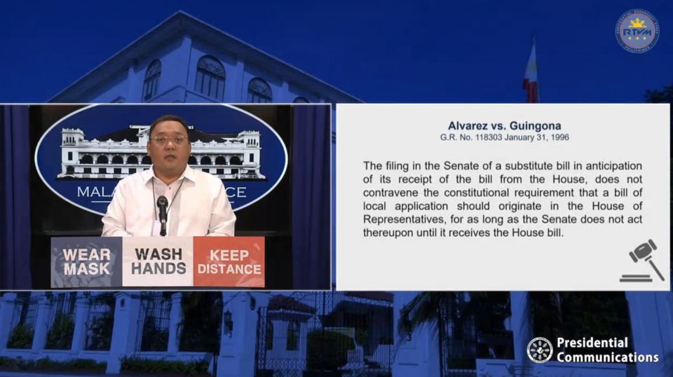 Ulitin ko lang po, hindi po dapat maging dahilan ng pagkaantala ng national budget itong nangyari sa Kamara. Malinaw po ang desisyon ng Tolentino. It is not the law but the revenue bill which is required by the Constitution to originate exclusively in the House of Representatives. Iyong pagsasampa lang po ng panukalang batas, dapat nauna ang pagsasampa sa Kamara de Representante. At dahil ito naman po ay nasunod, wala pong hadlang, para magpatuloy ang deliberation ng Senado sa national budget bill,” Roque explained.