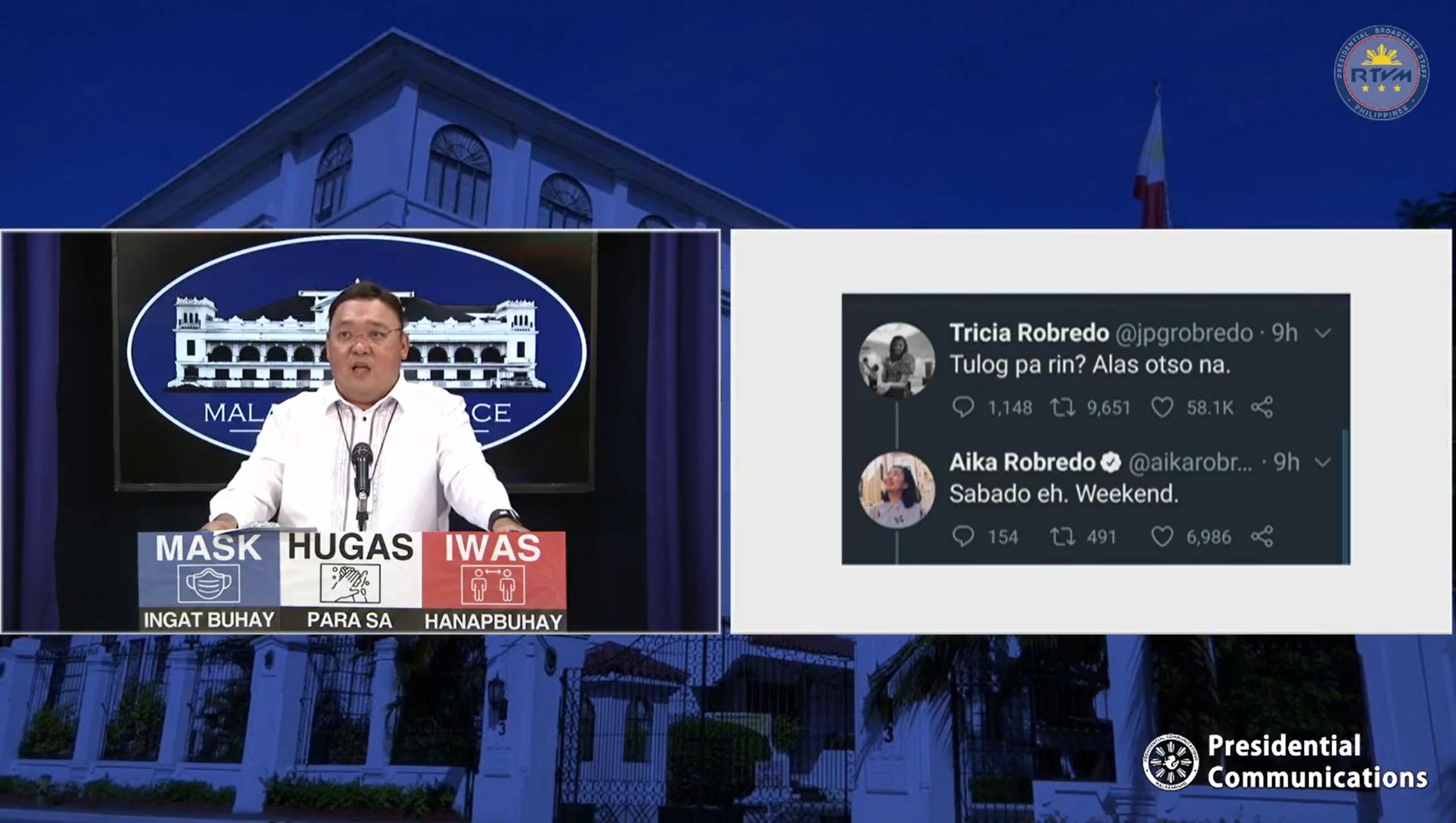 “Ito o, makita ninyo ‘no, unang-una iyong tweets ng mga malapit sa kaniya ‘no, iyong sarili niyang mga anak ‘ata: ‘Tulog pa rin, alas otso na.’ Galing po iyan kay Tricia Robredo, hindi ko po alam kung anong relasyon nila. Iyong galing naman kay Aika Robredo: ‘Sabado eh, weekend.‘”