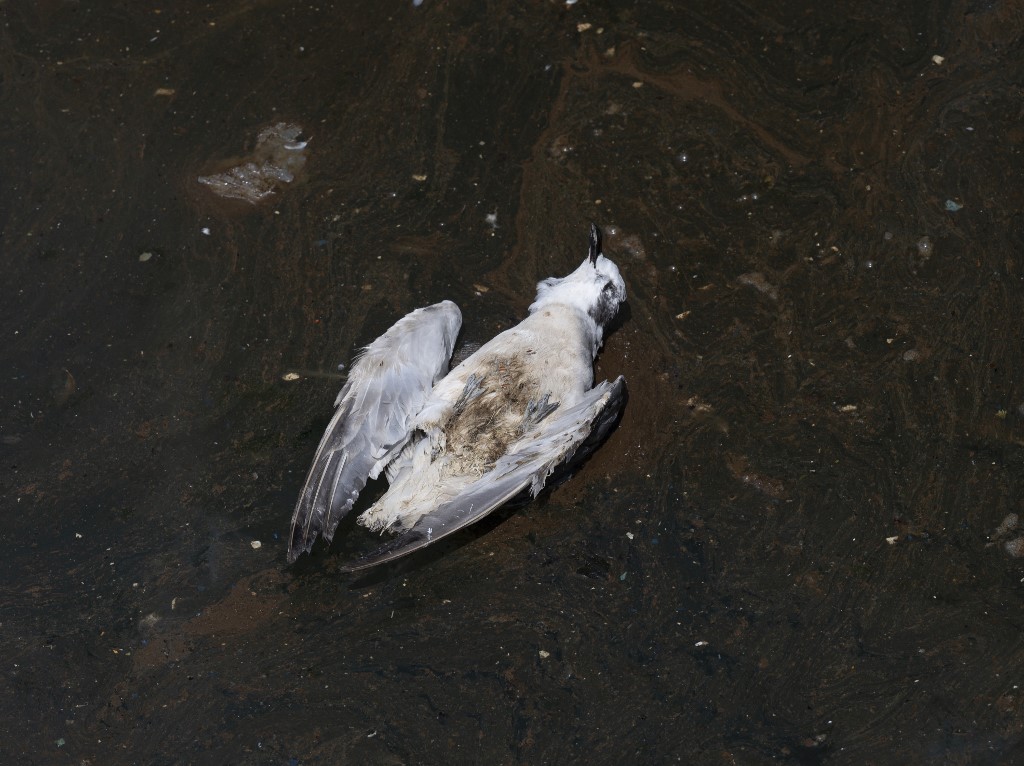 A dead seagull floats over oild waters in the bay of Ancon while investigators from the Peruvian National Service of Natural Areas Protected by the State (SERNANP) assess contamination levels and mortality rate of wildlife on the coast of Ancon, 35 kilometers north of Lima on January 29, 2022. – The spill, described as an “ecological disaster” by the Peruvian government, happened when an Italian-flagged tanker, the Mare Doricum, was unloading oil at the La Pampilla refinery, just off Peru’s coast around 30 kilometers (19 miles) north of Lima. The oil slick has been dragged by ocean currents about 140 kilometers north of the refinery, prosecutors said, causing the death of an undetermined number of fish and seabirds. (Photo by Cris BOURONCLE / AFP)
