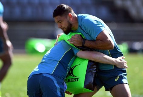 New Australian Wallabies rugby player Curtis Rona (R) is tackled during a training session in Sydney on August 17, ahead of the first Rugby Championship and Bledisoe Cup Test match against New Zealand on August 19. / AFP / William West /
