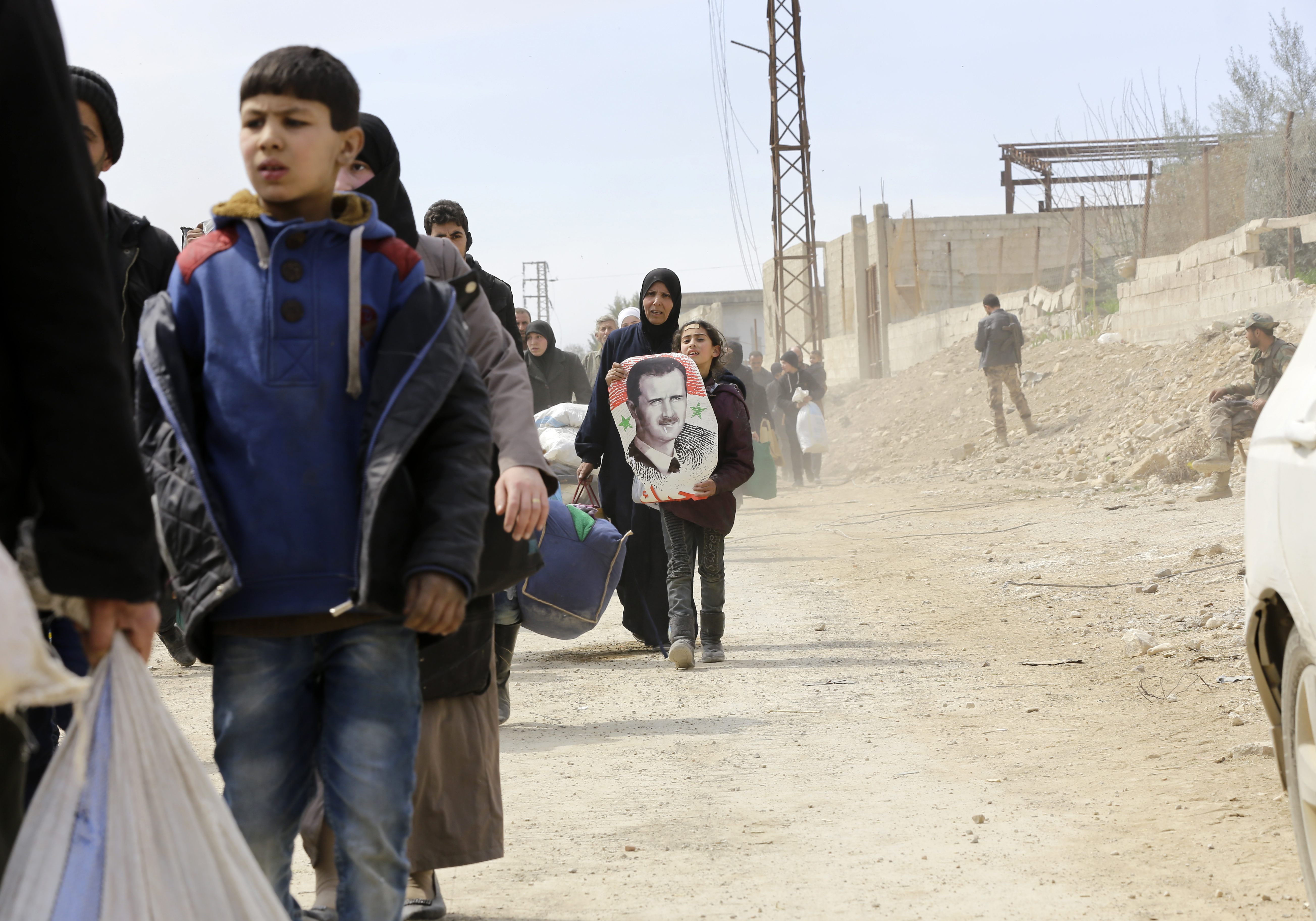 Thousands of civilians poured out of Eastern Ghouta as the capture of a key town brought Syria’s government even closer to retaking the devastated rebel enclave outside Damascus.