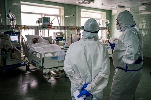 Doctor Dmitry Cheboksarov (R) wearing personal protective equipment (PPE) works in the intensive care unit for the COVID-19 coronavirus patients at Vinogradov City Clinical Hospital in Moscow on May 17, 2020. (Photo by Dimitar DILKOFF / AFP)