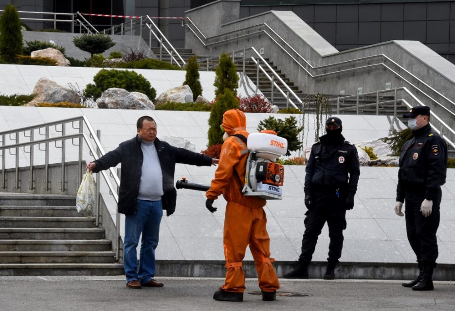Emergencies personnel wearing protective gear spray disinfectant on a man at the site of a fire at the Saint George hospital in Saint Petersburg on May 12, 2020. – A fire at a hospital in Russia’s second city Saint Petersburg on May 12 killed five coronavirus patients who had been attached to ventilators, officials and news agencies said. (Photo by OLGA MALTSEVA / AFP)