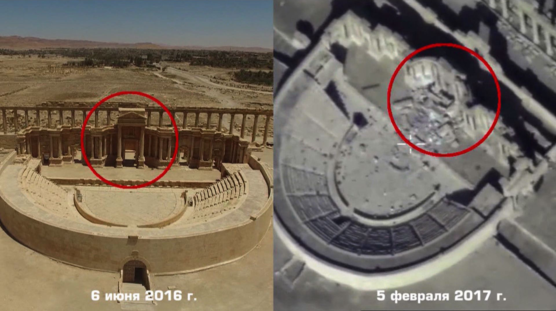 “The pictures clearly show that the terrorists blew up the proscenium — the central part of the ancient Roman theater — and the columns of the tetrapylon,” the Russian defense ministry said in a statement.