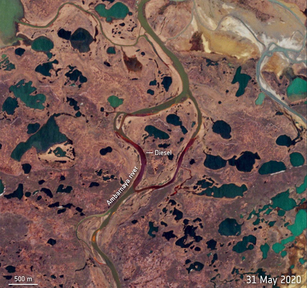 Satellite images released by the European Space Agency and Russia’s Roscosmos show a large spot of reddish fuel had travelled over 20 kilometres (12 miles) toward the lake from the spill site.