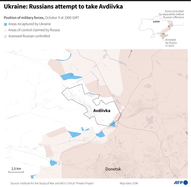 KRAMATORSK, Ukraine, Oct 10, 2023 (AFP) – Russian forces closed in on the frontline town of Avdiivka in east Ukraine on Tuesday, as Kyiv warned Moscow was stepping up strikes in an attempt to encircle it completely.