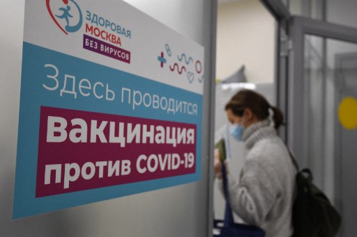 A woman enters a vaccination point to receive an injection of Russia’s Sputnik V (Gam-COVID-Vac) vaccine against the coronavirus disease in a public services office in Moscow on February 10, 2021. (Photo by NATALIA KOLESNIKOVA / AFP)