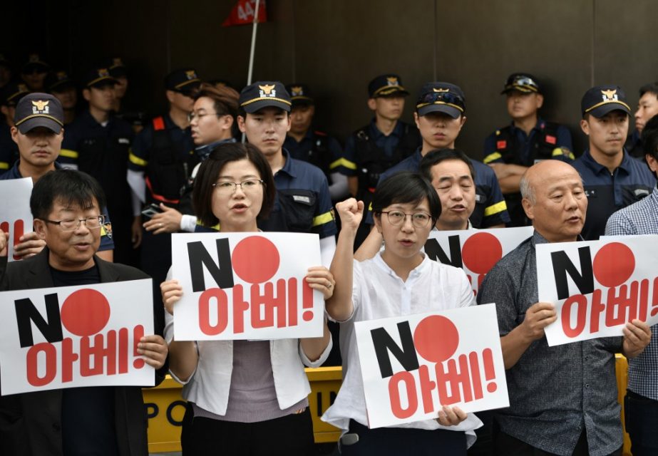 South Korean protestors hold placards reading “No Abe!” during a rally against Japan’s decision to remove South Korea from a so-called white list of favored export partners, in front of the Japanese embassy in Seoul on August 2, 2019. – South Korean President Moon Jae-in on August 2, condemned Japan’s decision to remove his country from a “white list” of favored trading partners, calling it a “reckless” move and threatening unspecified countermeasures. (Photo by Jung Yeon-je / AFP)