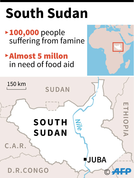 The world’s youngest nation on Monday declared famine in parts of the northern Greater Unity state where 100,000 people were facing starvation and another one million were on the brink of famine. A total of nearly five million are going hungry.