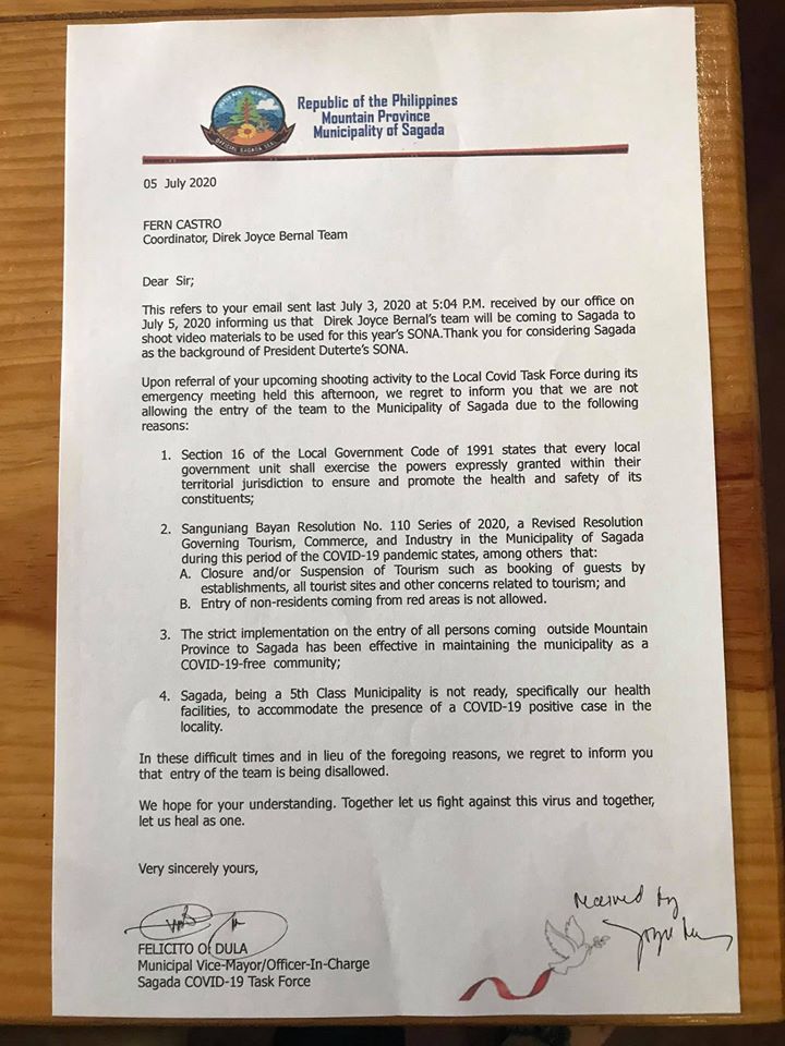 Sagada said a letter from Bernal’s team was also emailed “after office hours” on July 3 stating the team would be arriving the night of July 5.