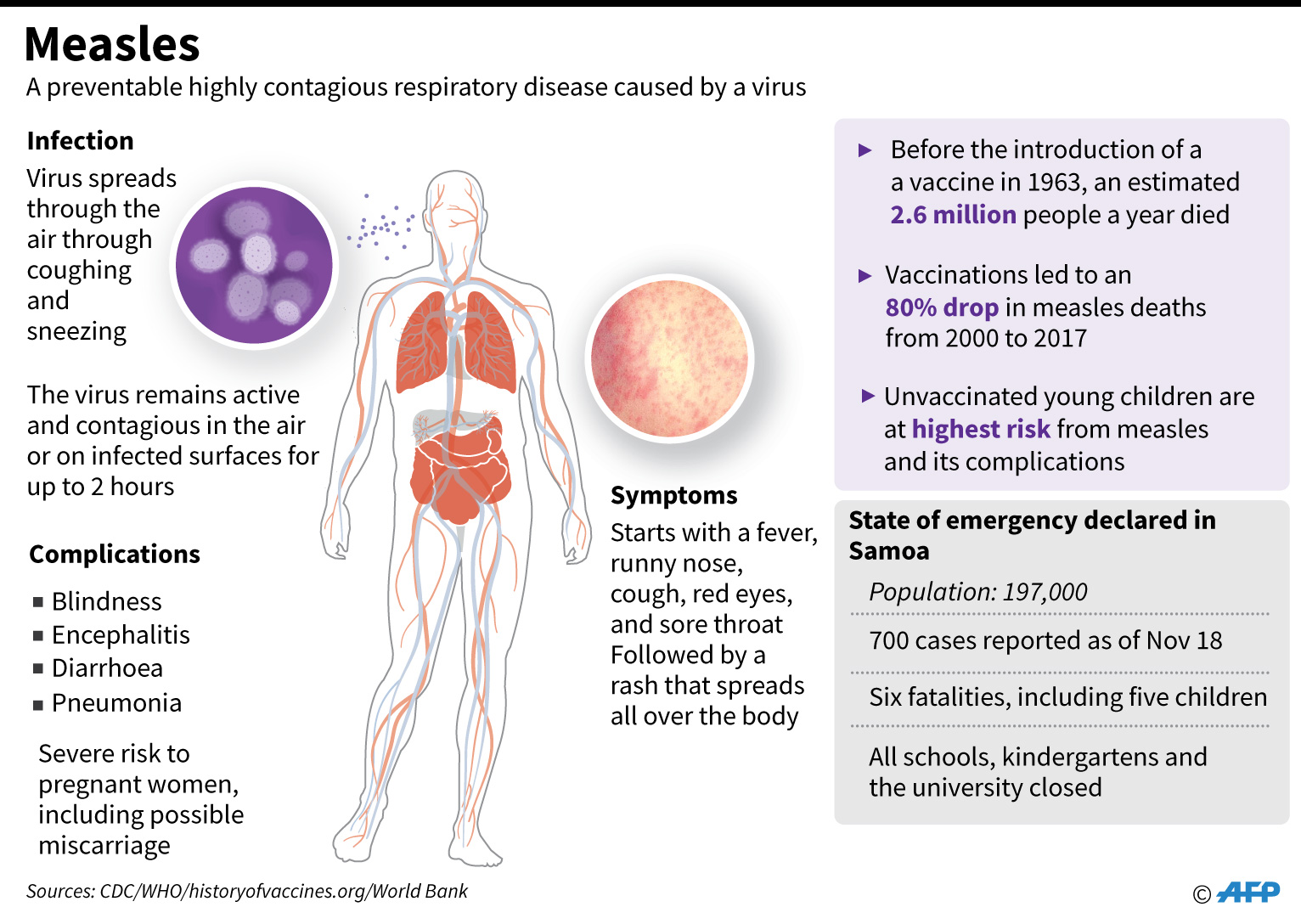 Samoa has declared a state of emergency as it tries to contain the outbreak, launching a compulsory vaccination program, closing schools and banning children from public gatherings.