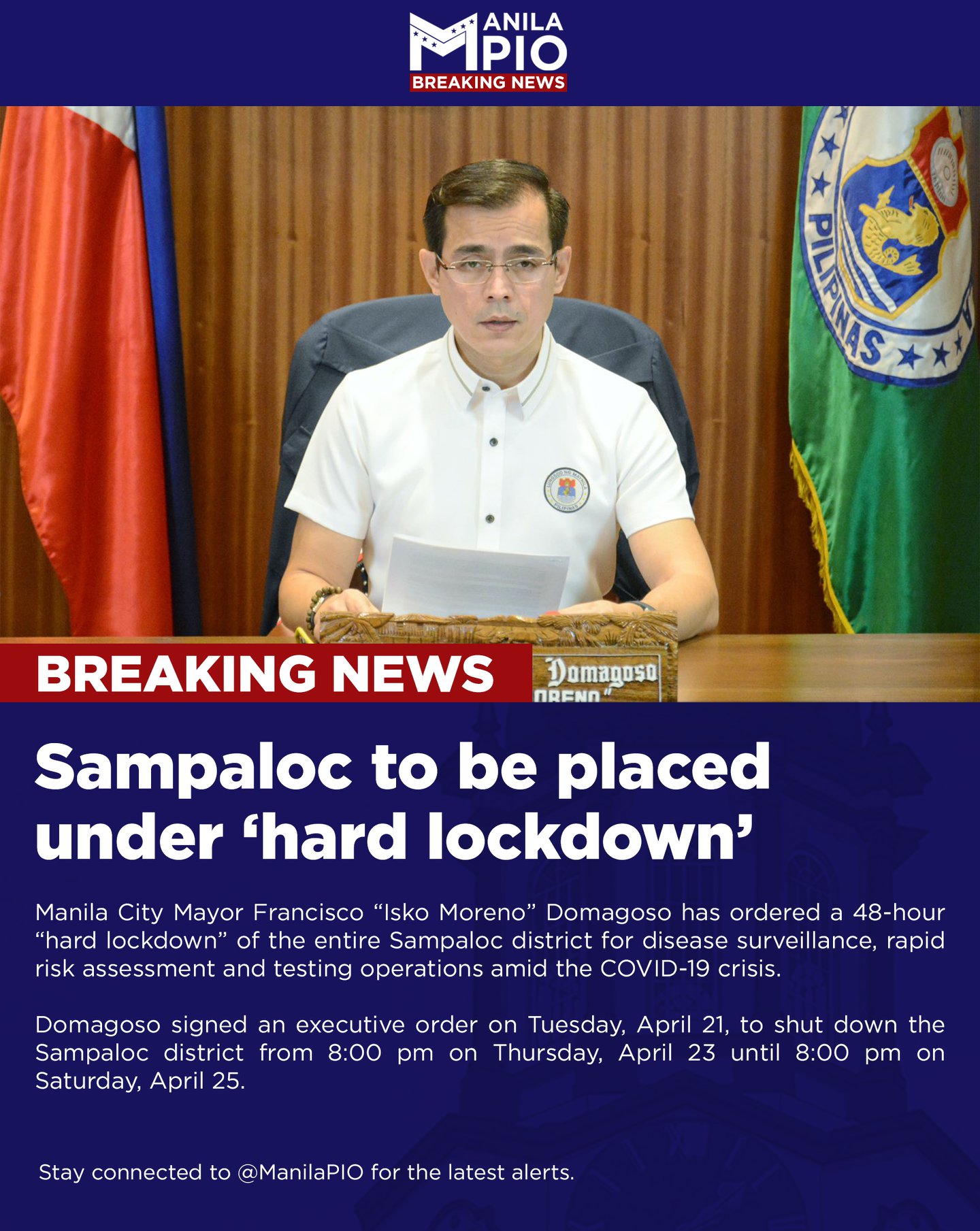 (Eagle News) – Manila Mayor Francisco “Isko Moreno” Domagoso signed on Tuesday, April 21 the executive order imposing a 48-hour “hard lockdown” of the entire Sampaloc district due to COVID-19.