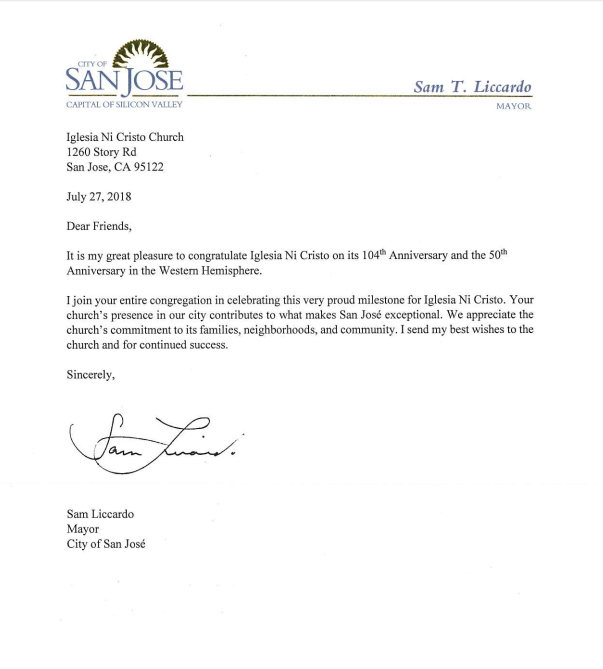 In his letter dated July 27, 2018, Mayor Sam Liccardo sent his best wishes to all the members of the Iglesia Ni Cristo or Church of Christ and wished for it continued success in the future.