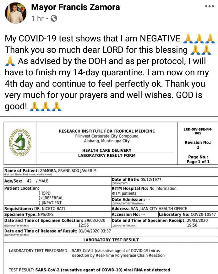 Zamora posted the result in a Facebook post on Wednesday, April 1.