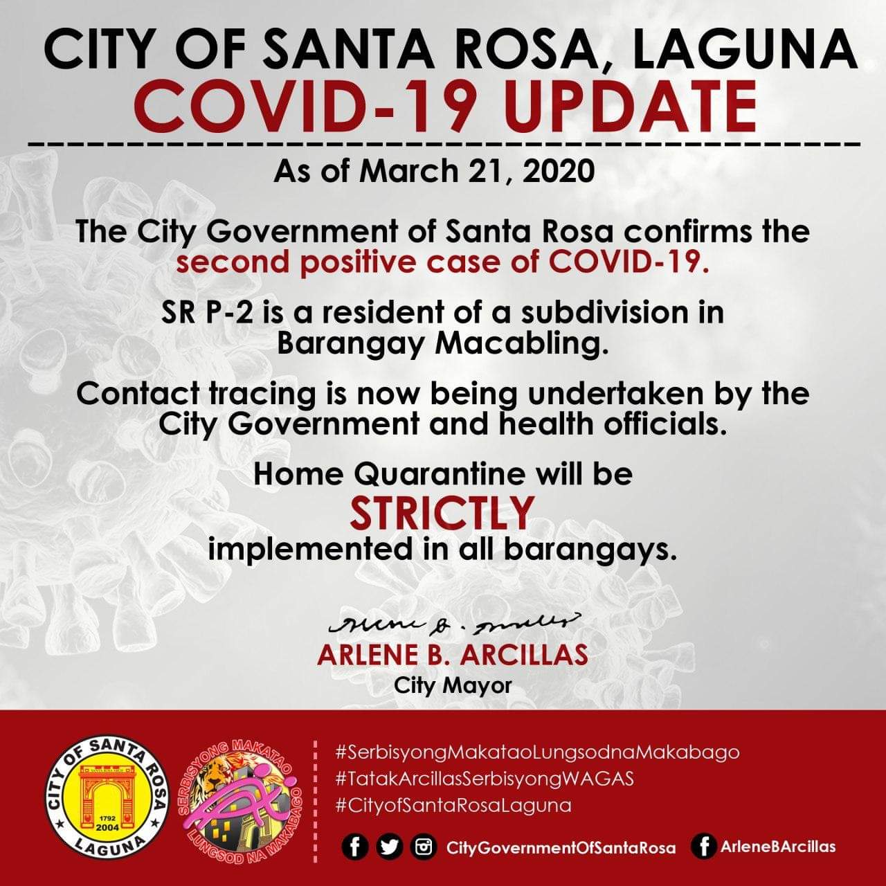 In a Facebook post, the Santa Rosa City government said that the second case was a resident of a subdivision in Barangay Macabling.