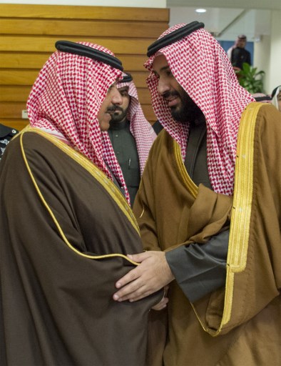 A handout picture provided by the Saudi Royal Palace on December 30, 2017 shows Crown Prince Mohammed bin Salman receiving Prince Mutaib bin Abdullah bin Abdulaziz in al-Janadriyah area some 60 kilometres east of Riyadh. / AFP PHOTO / Saudi Royal Palace / BANDAR AL-JALOUD /