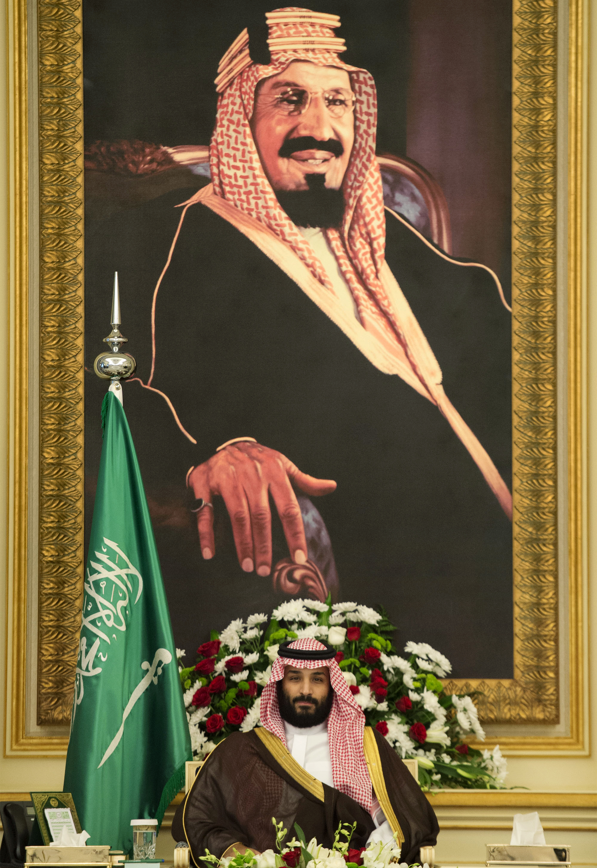 The portrait in the background shows King Abdulaziz al-Saud, the founder of the Saudi kingdom. / AFP PHOTO /