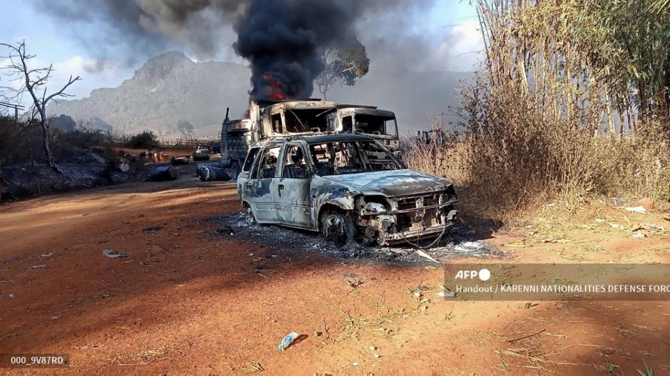 On Saturday, photos appeared on social media purporting to show two burnt-out trucks and a car on a highway in Hpruso township in eastern Kayah state, with the charred remains of bodies inside.