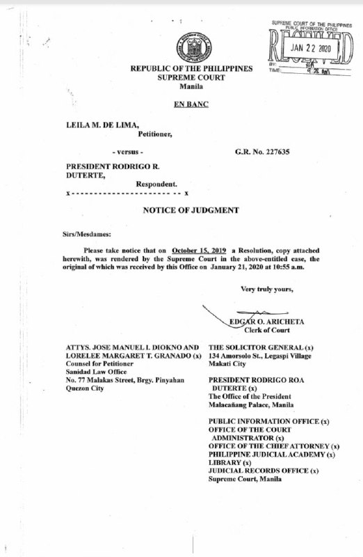 The resolution was signed by all SC justices, including then-Chief Justice Lucas Bersamin, except Associate Justice Jose Reyes Jr., who was on leave.