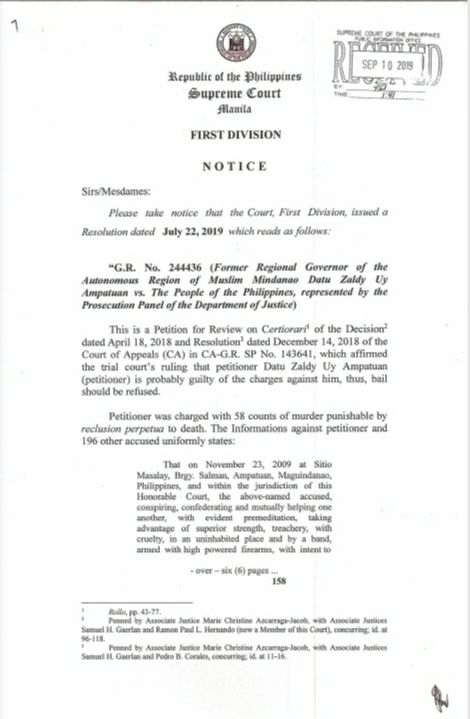 In denying the petition for review on certiorari of Ampatuan, who faces 58 counts of murder over the Maguindanao massacre, the first division noted the “failure” of Ampatuan to “sufficiently show any reversible error” in the CA decision dated April 18, 2018 and the resolution dated December 14, 2018 that upheld the Quezon City Regional Trial Court’s decision Ampatuan was probably guilty of the charges against him.