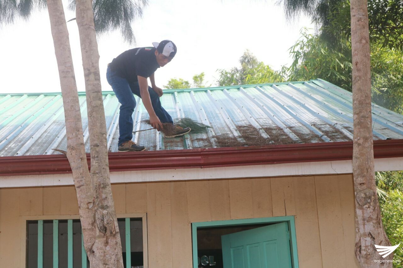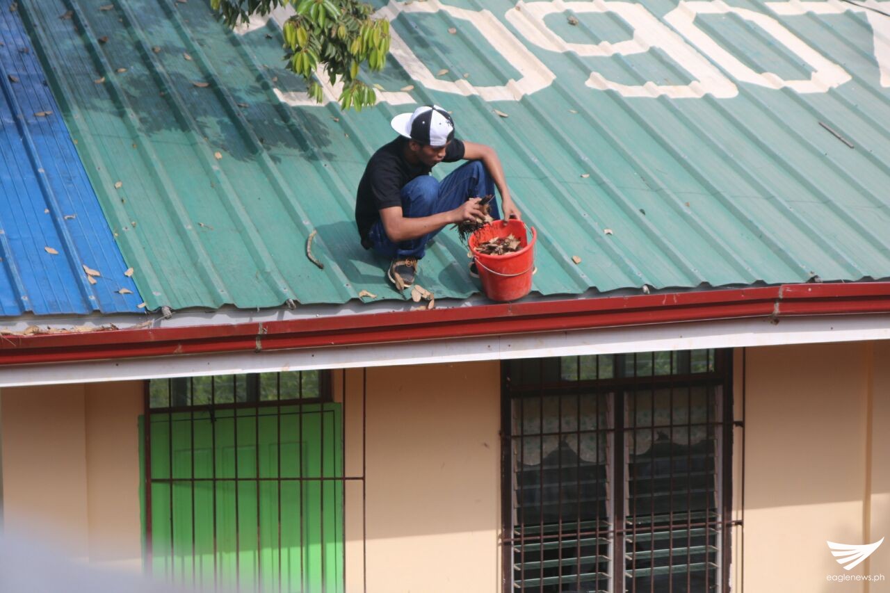 Inalis din nila ang makapal na tumpok na dahon ng puno sa bubungan ng dalawang classroom ng paaralan.