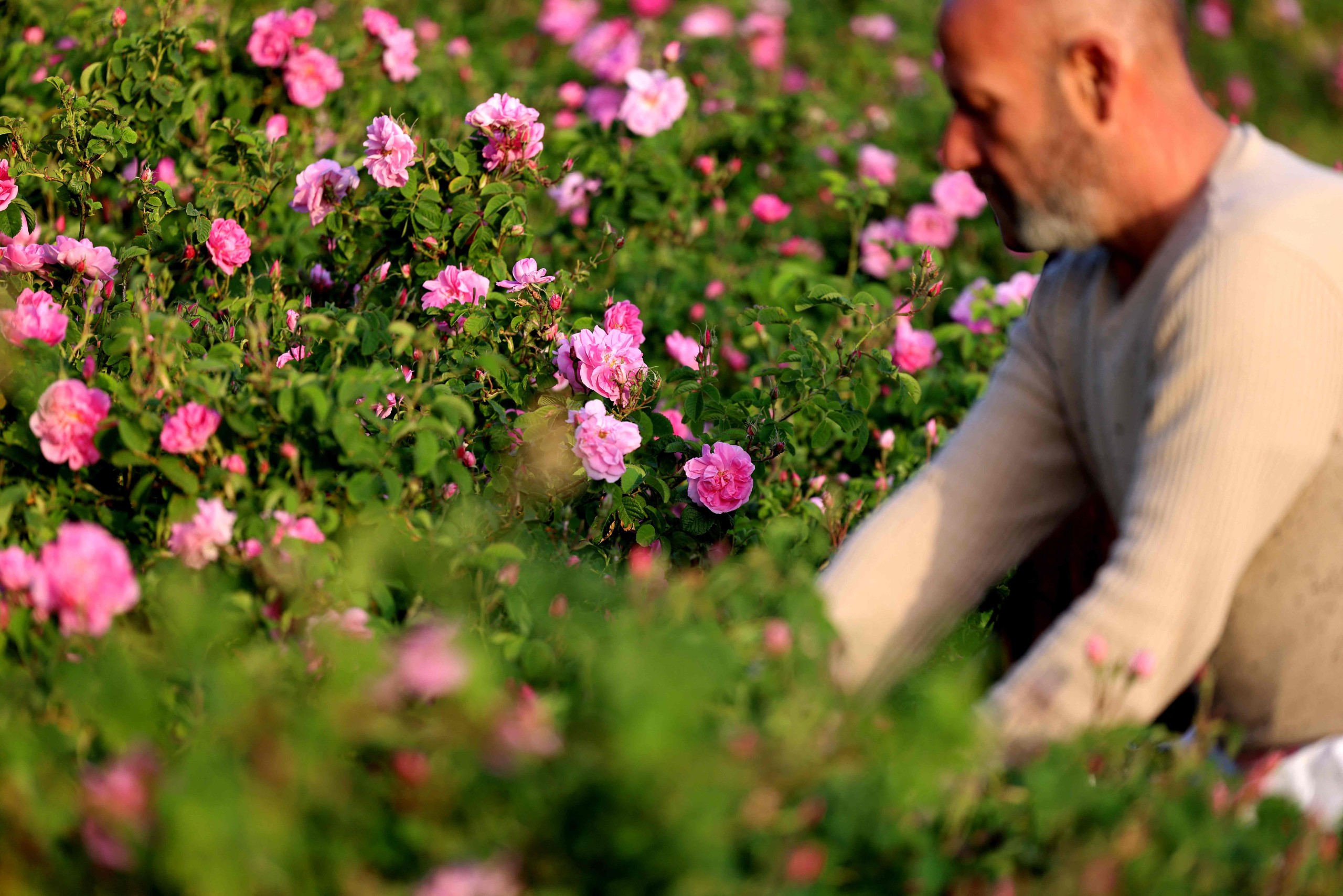 A soft bag tied around her waist and her hands scratched from the thorns, the 64-year-old plucks the small, pink buds from their bushes as their rich and heady scent wafts across the hill.