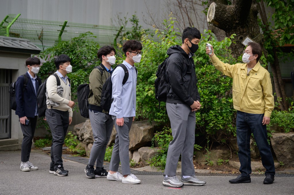 “It’s really exciting to meet my friends and teachers face to face, but we have to strictly follow the disinfection guidelines,” said Oh Chang-hwa, student president of Kyungbock High School in Seoul.