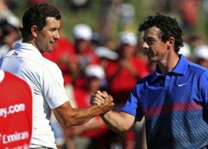 Australia’s Adam Scott (L) shakes hands with Northern Ireland’s Rory McIlroy after they finished on the eighteenth and final hole during the fourth round of the Australian Open golf tournament at Royal Sydney Golf Club December 1, 2013. REUTERS/Steve Christo