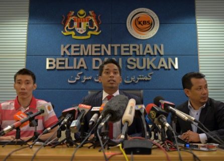 Malaysia’s minister for youth and sports Khairy Jamaluddin (C) speaks as Malaysian badminton player Lee Chong Wei (L) and Badminton Association of Malaysia (BAM) deputy president Norza Zakaria (R) listen during a press conference in Putrajaya on April 27, 2015. AFP / Mohd Rasfan/