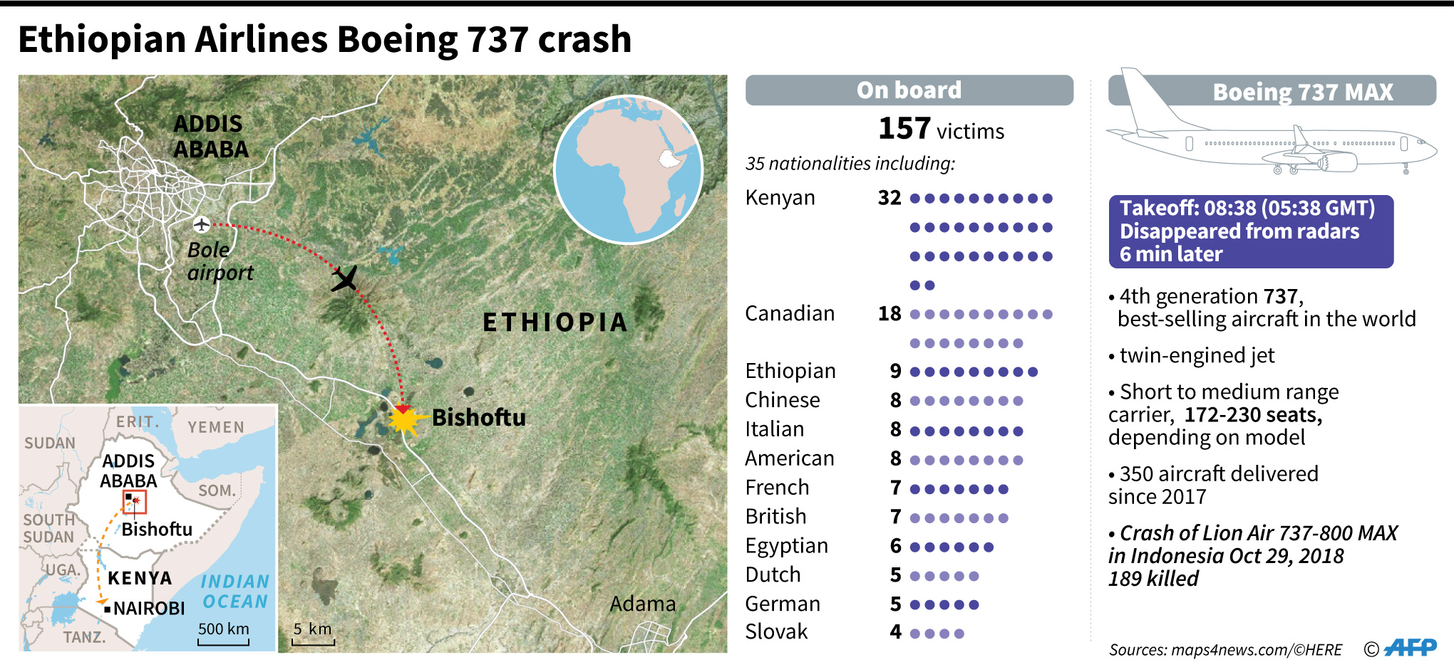 Eight crew and 149 passengers from 35 countries perished when Flight ET 302 ploughed into a field near Tulu Fara village outside the town of Bishoftu, some 60 kilometres (40 miles) southeast of Addis Ababa.