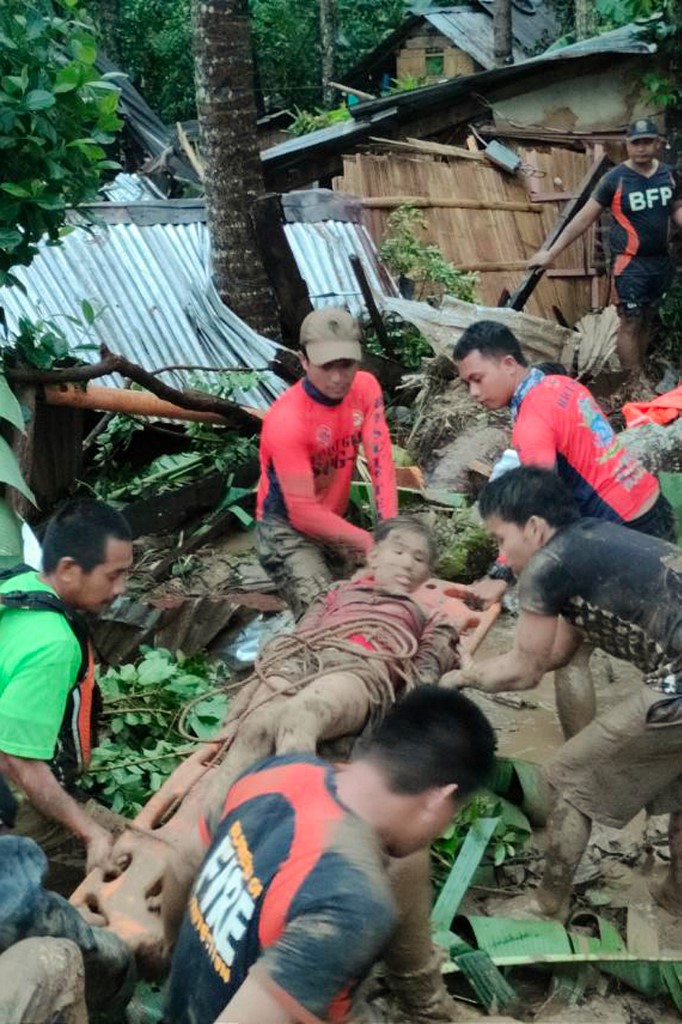 A Philippine Coast Guard video shared on Facebook showed six rescuers carrying a mud-caked woman on a stretcher to safety.