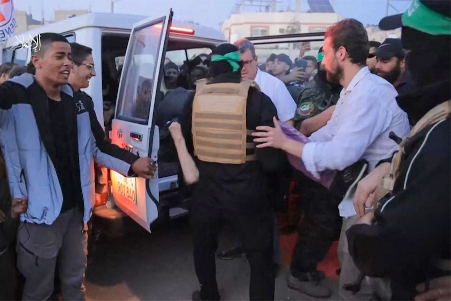 A two-minute video released by Hamas showed masked militants with rifles, wearing military fatigues and the green headband of the Islamist movement’s armed wing, handing hostages over to the Red Cross.