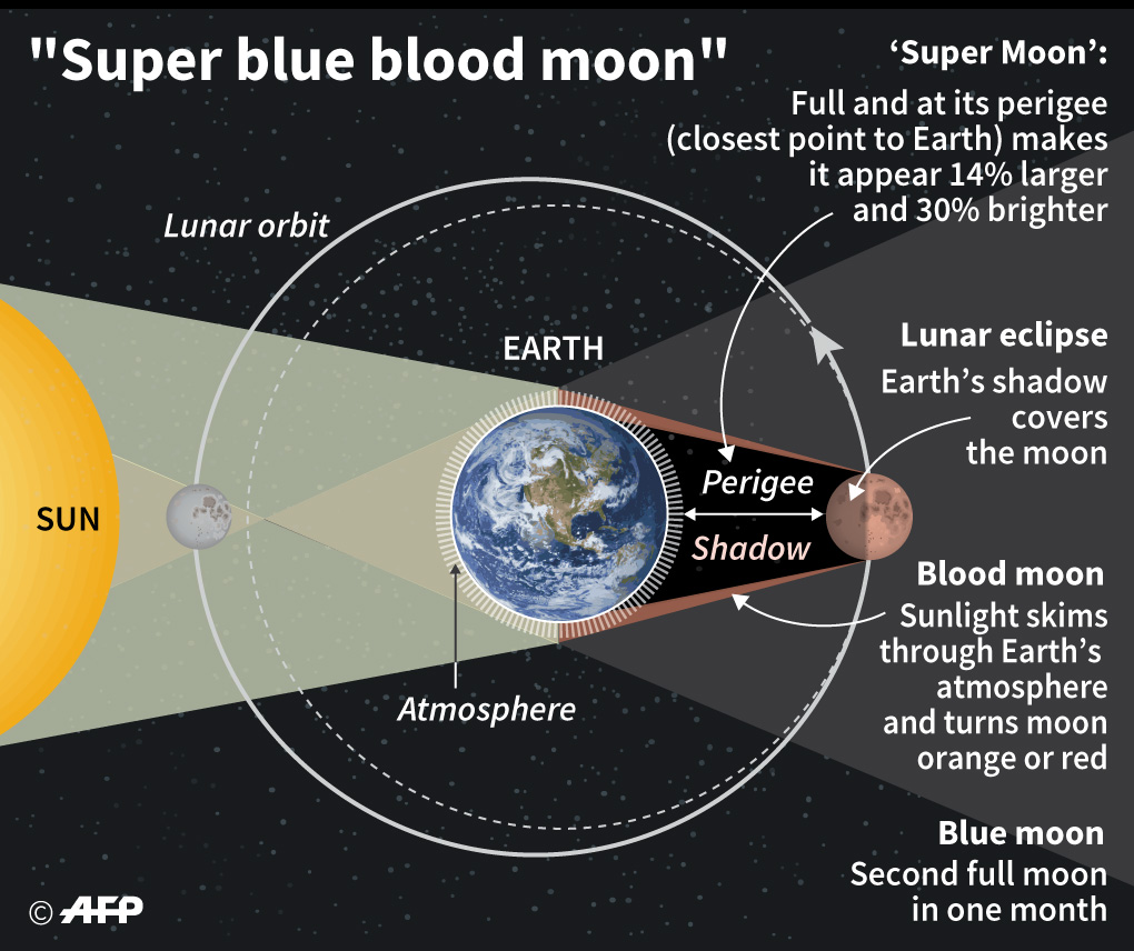 What will happen is not just a blue moon, but a “super blue blood moon” – when skygazers will catch a rare triple treat of a glimpse of the giant crimson moon, thanks to a rare lunar trifecta that combines a blue moon, a super moon and a total eclipse.