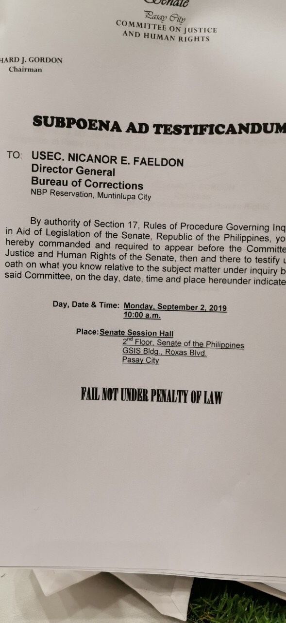Senator Richard Gordon, panel chair, signed the subpoena for Faeldon to testify on Saturday night.