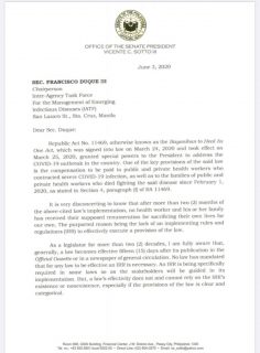 In asking Duque to implement section 4, paragraph I of Republic Act 11469 in a letter, Sotto noted “no health worker and his or her family has received their supposed remuneration for sacrificing their own lives for our own.”