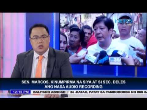 Senator Bongbong Marcos confirmed that it was he and Presidential Adviser to the Peace Process Teresita Deles who were talking in the audio recording revealed by retired General Diosdado Pederoso. Marcos added that said recording was unauthorized and that it occurred in his office.