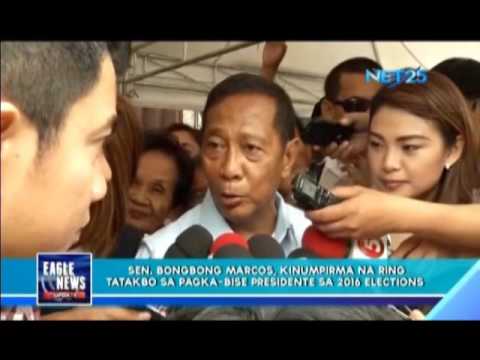 Senator Ferdinand Marcos Jr. confirmed his plans to run as vice-president in the 2016 elections. Prior to this, Senator Marcos went to Davao City to consult with Mayor Rodrigo Duterte regarding his plans, with said mayor announcing his support for said plans.