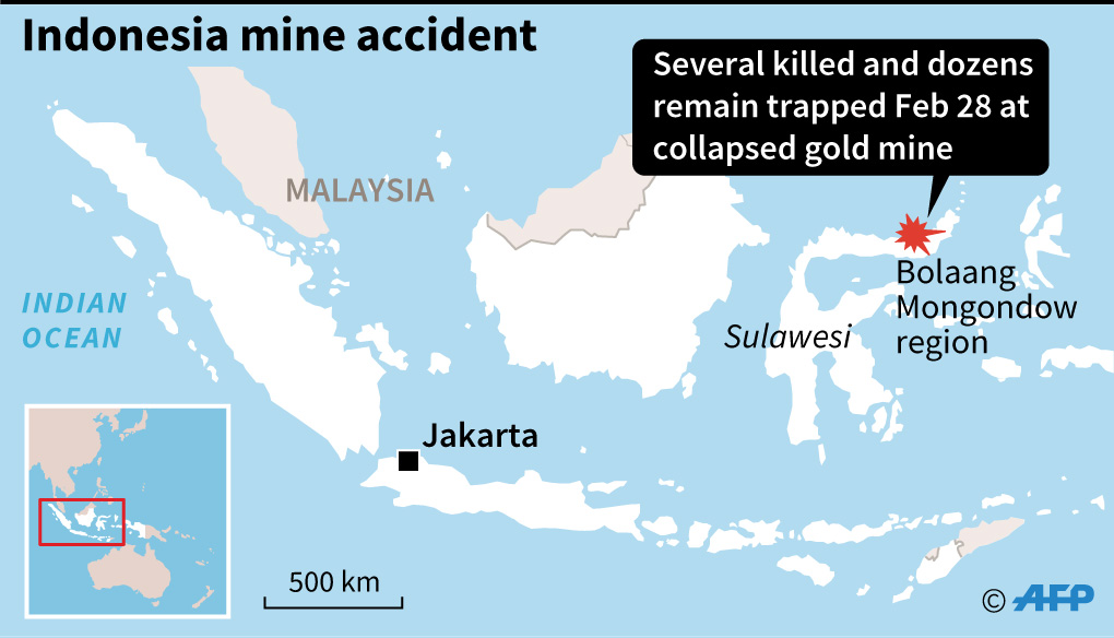 NORTH SULAWESI, India (AFP) — At least seven people have died and dozens more are still trapped beneath the rubble of an illegal gold mine that collapsed in Indonesia, officials said Thursday, as rescuers frantically searched for survivors.