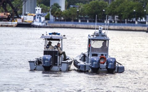 JACKSONVILLE, FL – AUGUST 26: Jacksonville Sheriff’s officers patrol the St. Johns River in front of Jacksonville landing after a shooting on August 26, 2018 in Jacksonville, Florida. A shooting rampage during a Madden 19 video game tournament at the site claimed four lives, with several others wounded, according to published reports. Mark Wallheiser/Getty Images/AFP