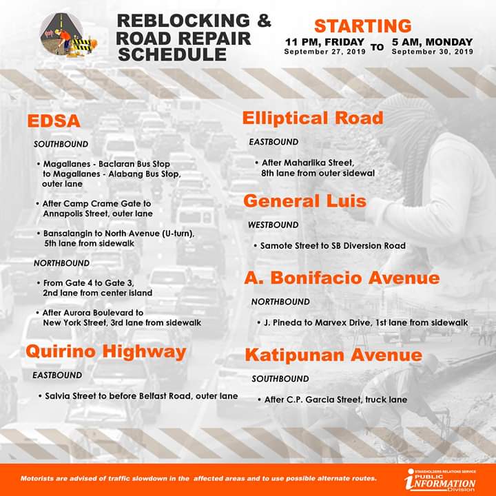 The Department of Public Works and Highways said the following have been subjected to the repair starting Friday, 11 p.m.: